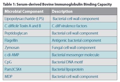 The GI tract acts as the gateway to the rest of the body, making the health of the gut barrier critical to overall health. Environmental triggers like poor diet, high stress and toxin exposure can lead to GI challenges. In practice, probiotics are a natural choice for supporting beneficial bacteria in the gut, but supplementation to eliminate unwanted microbes should also be considered. SBI has been shown to bind microbes and toxins, further enhancing microbiome balance and facilitating gut barrier strength.2,3 Broad-spectrum binding capabilities (See Table 1) demonstrate the positive influence of nonallergenic forms of immunoglobulins.1 As seen in several studies, SBI has the potential to bind many types of microbes and toxins.1 This binding and elimination decreases microbe and toxin encounters by the immune system and resets immune tolerance.2,3